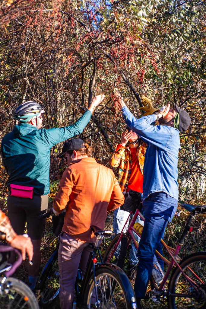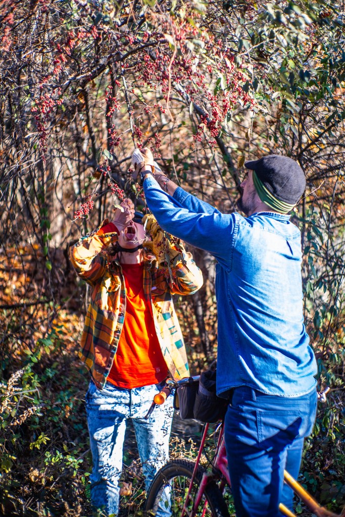 the above photos are from last month — the last of the autumn olive harvest around here. its an invasive, and dang is it prolific… and tasty! those big ol berries, especially after a frost, taste like a good tart apple, and they are loaded with a dense array of antioxidants. 2-3X the lycopene of tomatoes! as you can see here, these were nice and ripe and ready to just be devoured by a group of lycopene hungry cyclists.
