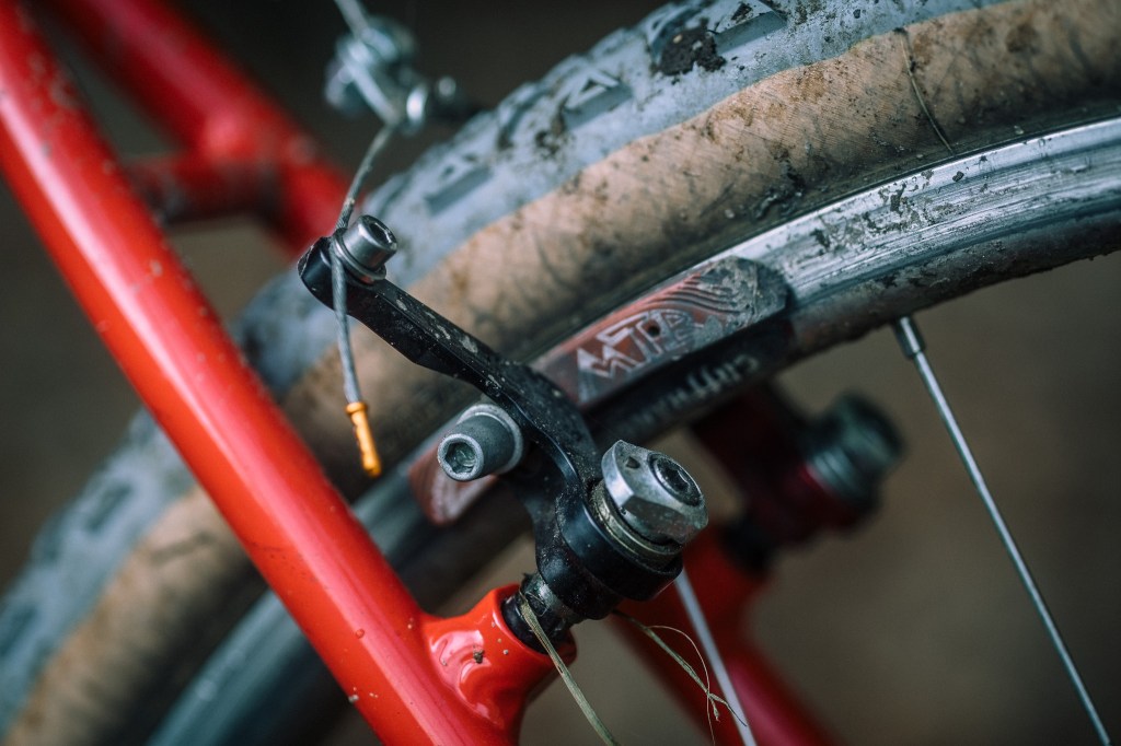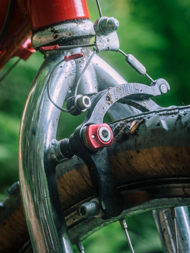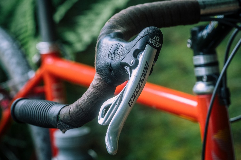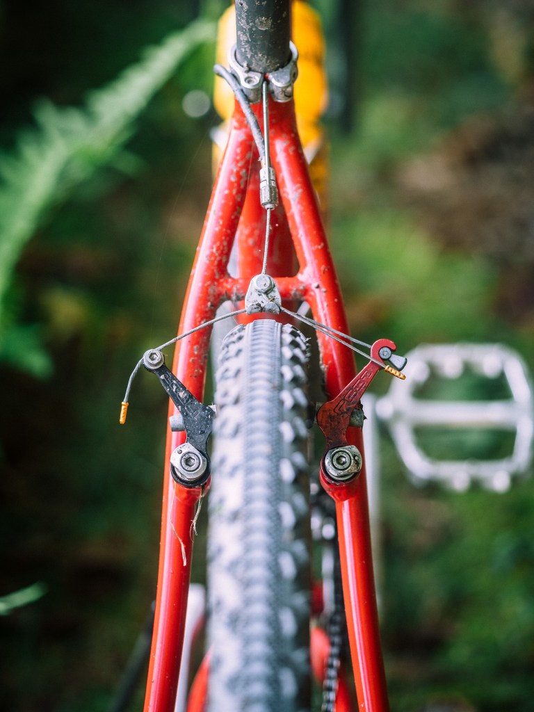 so center pulls in the front, and cantilevers in the rear … already a weird bike. I wanted drop bars on this one, since the larger clearanced show bike would be flat bar — the positive rise Salsa stem from the parts bin would be just the ticket. I pried open the 25.4 face plate and wiggled in a good ol’ 26.0 Soma Portola dirt drop bar with Campy ergo 10 controls that I would run to an 8 speed cassette in the rear. some old Rustines grips help with the grip in the drops.