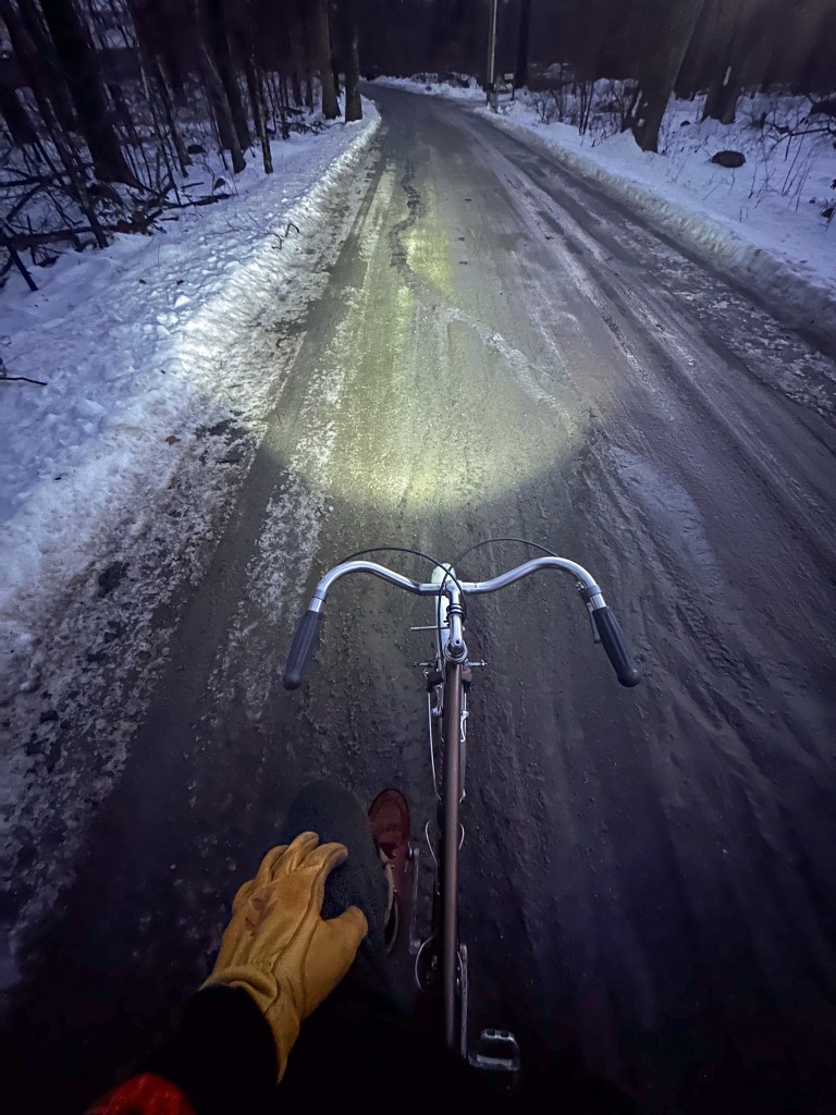 so the snow comes and goes, and dang is it nice in the woods when the conditions allow. 20 degrees out? you can ride without gloves and a hat on some slow speed CT rock crawl chunk and be toasty as a baked potato. its riding on the road when things get cold and unenjoyable IMO. but after a snowfall and when the stuff sticks around and gets icy (right now), you can only ride the road. while the roads are as beautiful as they get around here … I am not trying to lose toes here after work each day. so I have been running and doing log sports when riding the road just isn’t in the cards.