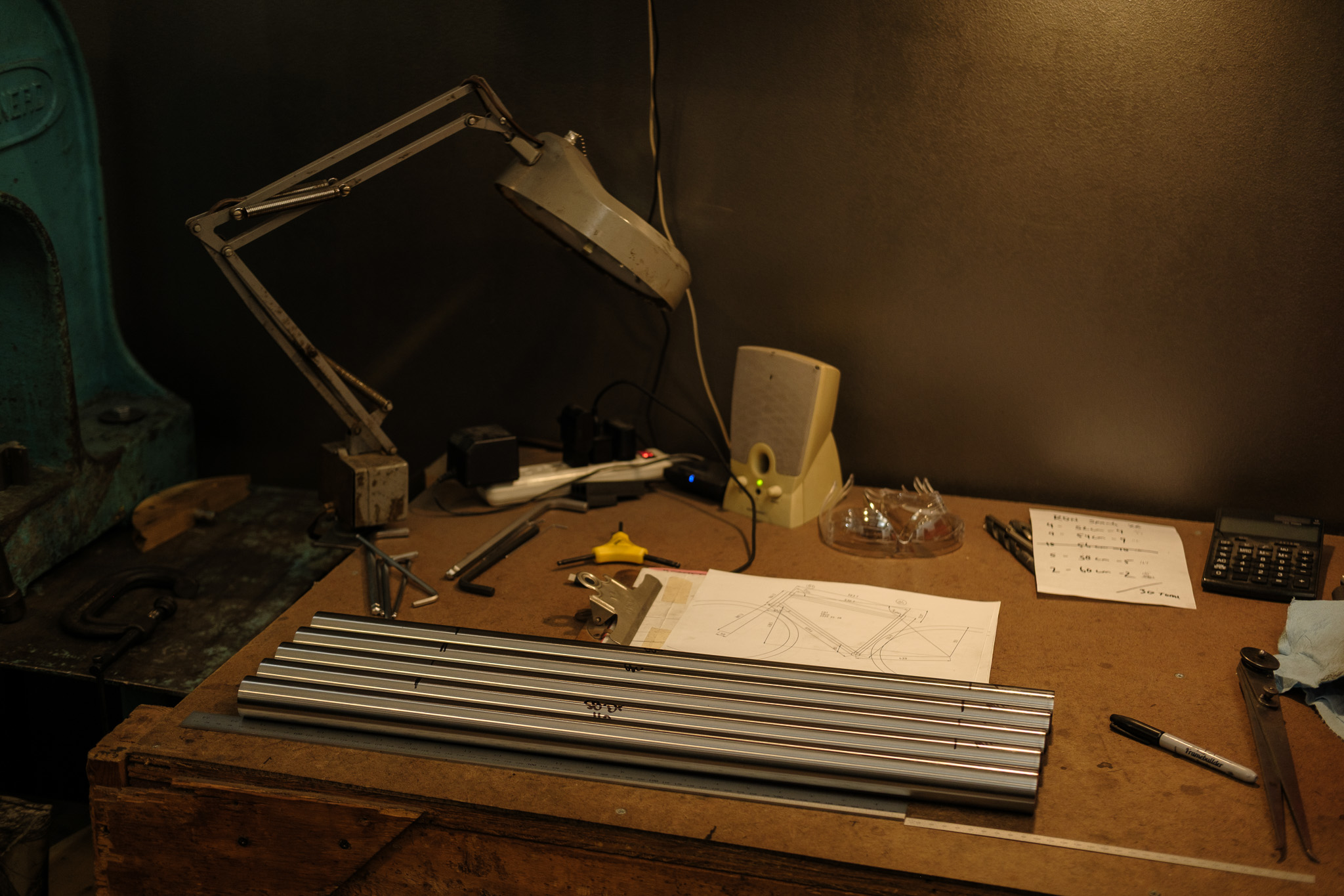 buckets of what will be future bikes, and checking the drawings before mitering.